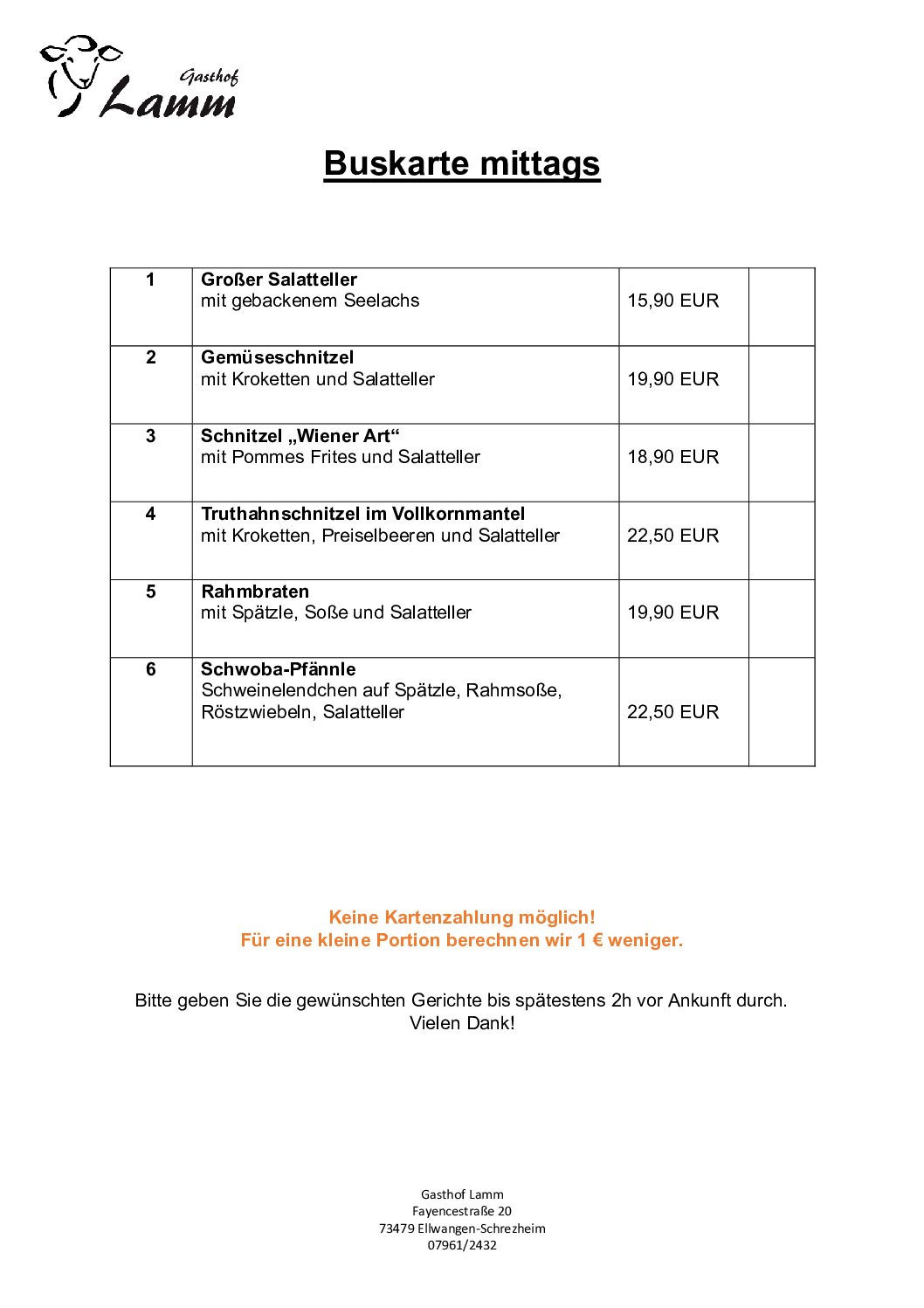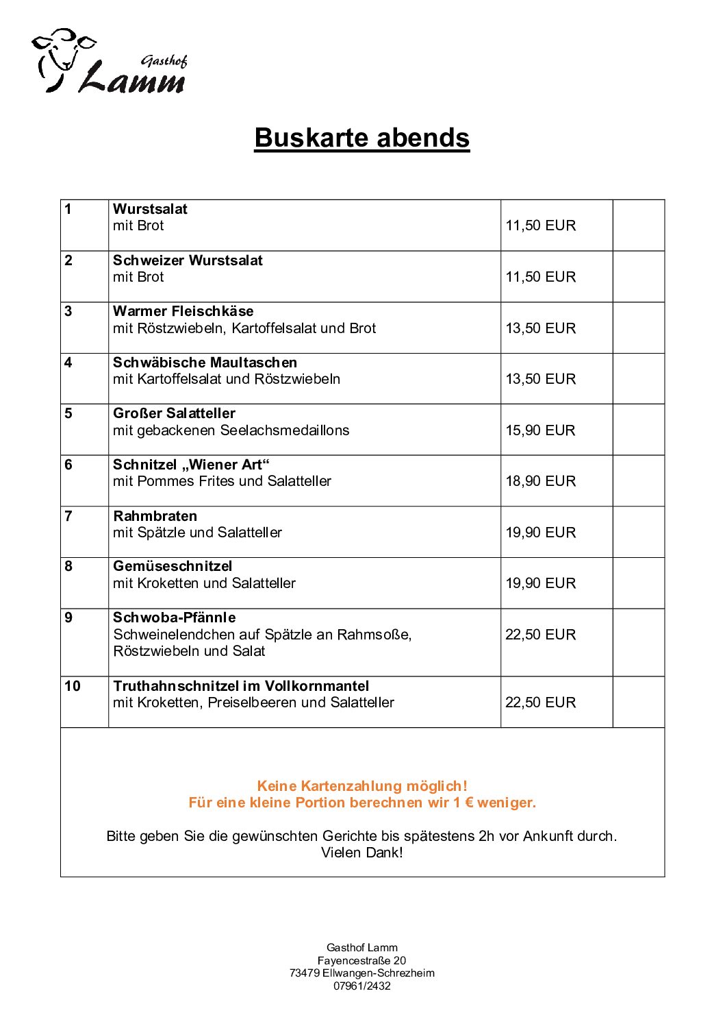 Zur Vorbestellung bieten wir für Reisegruppen eine gesonderte Speisekarte an. Für einen reibungslosen Ablauf empfehlen wir Ihnen, die untenstehende Liste rechtzeitig an uns telefonisch (07961 2432) oder per Mail (info@lamm-schrezheim.de) ausgefüllt zu übermitteln.